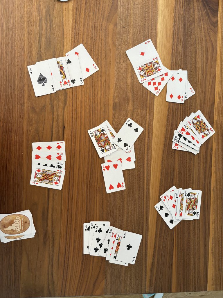 Deal out all Cards to all Players. First round – no exchanging of cards.